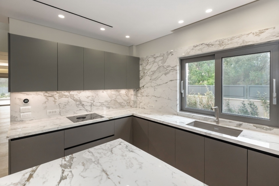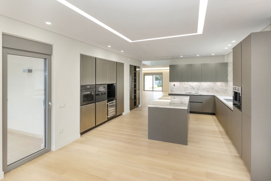 The fully equipped kitchen, made with top-quality materials, is both stylish and practical, ideal for gatherings and daily living.